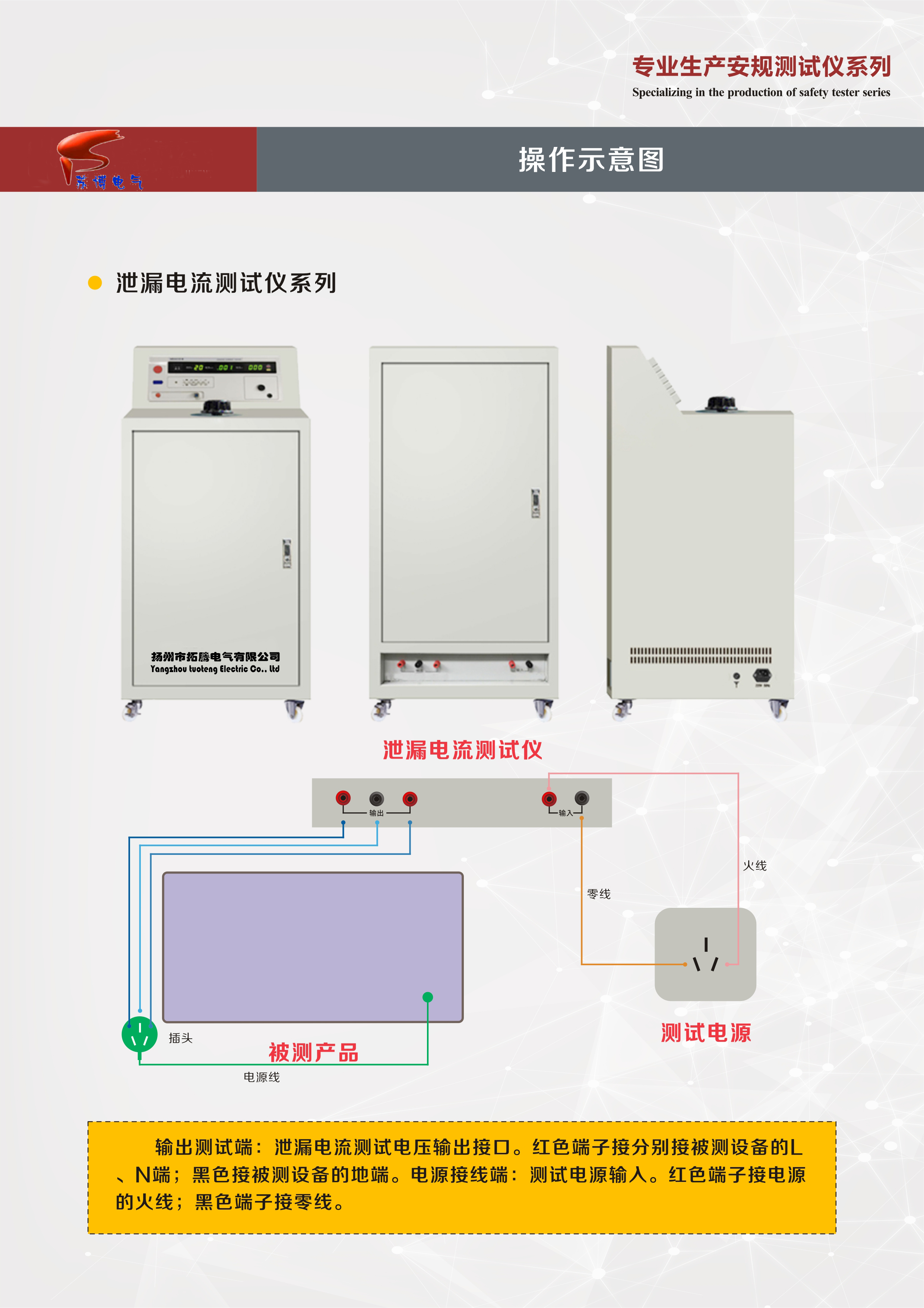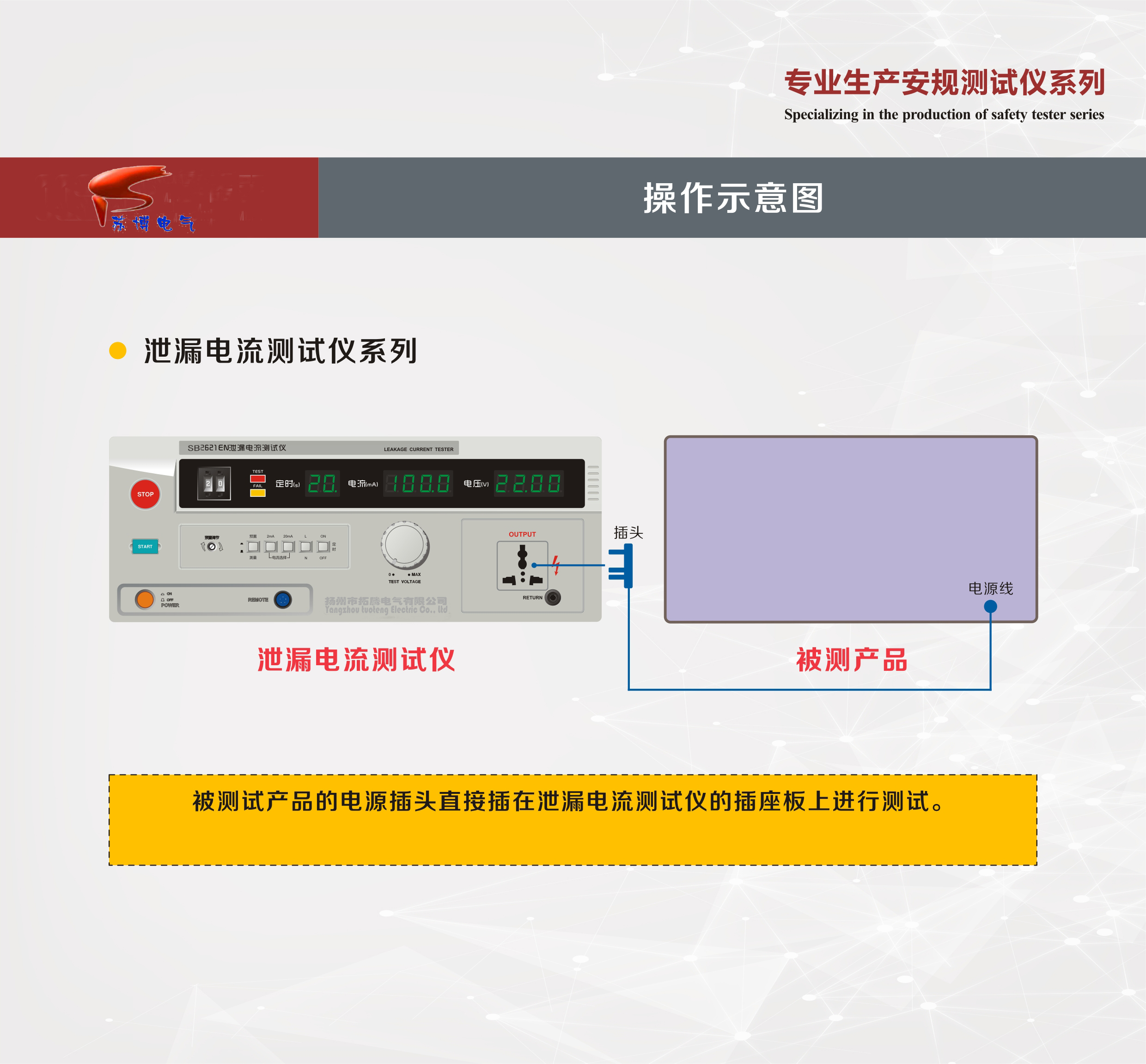 常規(guī)泄漏測(cè)試儀器按照IEC、ISO、BS、UL、JIS等國(guó)際國(guó)內(nèi)的安全標(biāo)準(zhǔn)而設(shè)計(jì), 適合用于各種家用電器、電源、電纜線、接線端子、高低壓膠木電器、開(kāi)關(guān)、電源插頭座、電機(jī)、影碟機(jī)、洗衣機(jī)、離心式脫水機(jī)、微波爐、電烤箱、電火鍋、電視機(jī)、電風(fēng)扇、醫(yī)療儀器、電子儀器儀表以及強(qiáng)電系統(tǒng)的安全泄漏電流的測(cè)試, 同時(shí)也是科研實(shí)驗(yàn)室、技術(shù)監(jiān)督部門(mén)不可缺少的泄漏電流檢測(cè)設(shè)備。